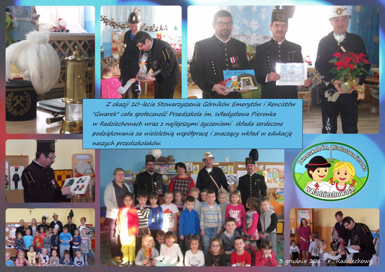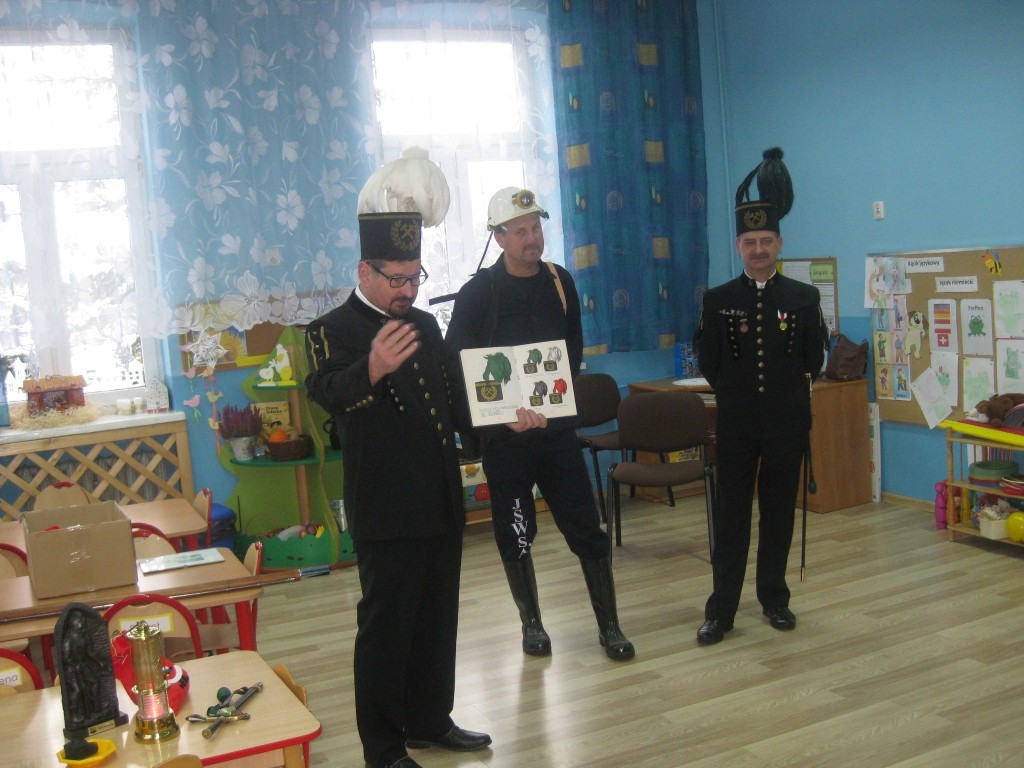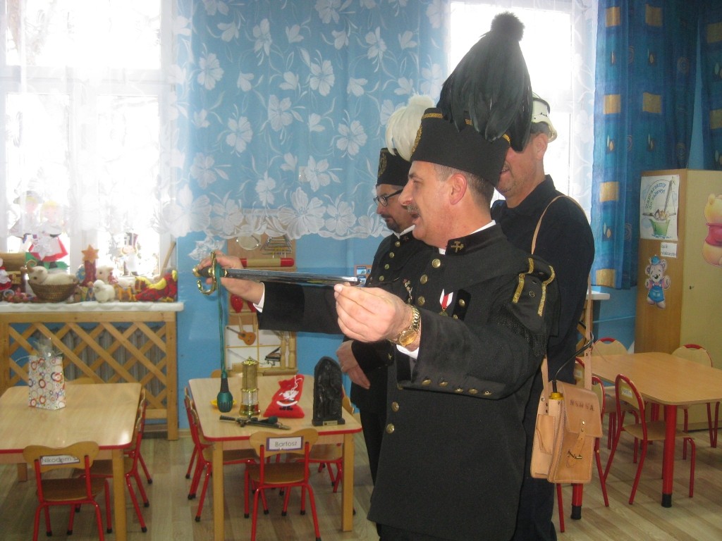 Współpraca Stowarzyszenia „GWAREK” z radziechowskim przedszkolem trwa od wielu lat. Coroczne spotkania przygotowywane są przez górników z wielką starannością i dbałością o atrakcyjne dla przedszkolaków rekwizyty. Panowie: Mirosław Jarco, Marek Tlałka i Grzegorz Brodka opowiedzieli przedszkolakom o trudnej i niebezpiecznej pracy górników. Dzieci dowiedziały się, w jaki sposób wydobywany jest węgiel i jak bardzo jest nam potrzebny w życiu codziennym. Pan Mirosław Jarco przybliżył przedszkolakom postać patronki górników Świętej Barbary. Nie zabrakło też tradycyjnej legendy śląskiej o Skarbniku dbającym o bezpieczeństwo górników. Natomiast panowie Marek Tlałka i Grzegorz Brodka opowiedzieli o trudach codziennej pracy pod ziemią porównując warunki panujące tam dawnej i współcześnie. Dzieci poznały rodzaje górniczych ubiorów i znaczenie kolorowych pióropuszy na czakach. Spotkanie zakończone zostało podziękowaniami dla miłych gości i wspólnymi grupowymi zdjęciami pamiątkowymi. Z okazji niedawnego święta górniczego Barbórki oraz 10-lecia Stowarzyszenia Górniczego "GWAREK" życzymy wszystkim górnikom dużo zdrowia, pomyślności w życiu i kolejnych pięknych jubileuszy. Dziękujemy miłym gościom za kolejny rok wartościowej współpracy z przedszkolem i zapraszamy ponownie w nasze progi. Stowarzyszenie Górnicze "GWAREK" poprzez pielęgnowanie tradycji górniczych trwale zapisuje się na kartach historii i kultury miejscowości Radziechowy. Gratulujemy!