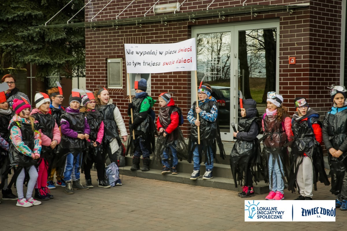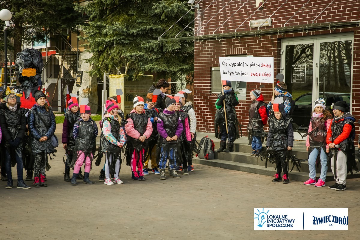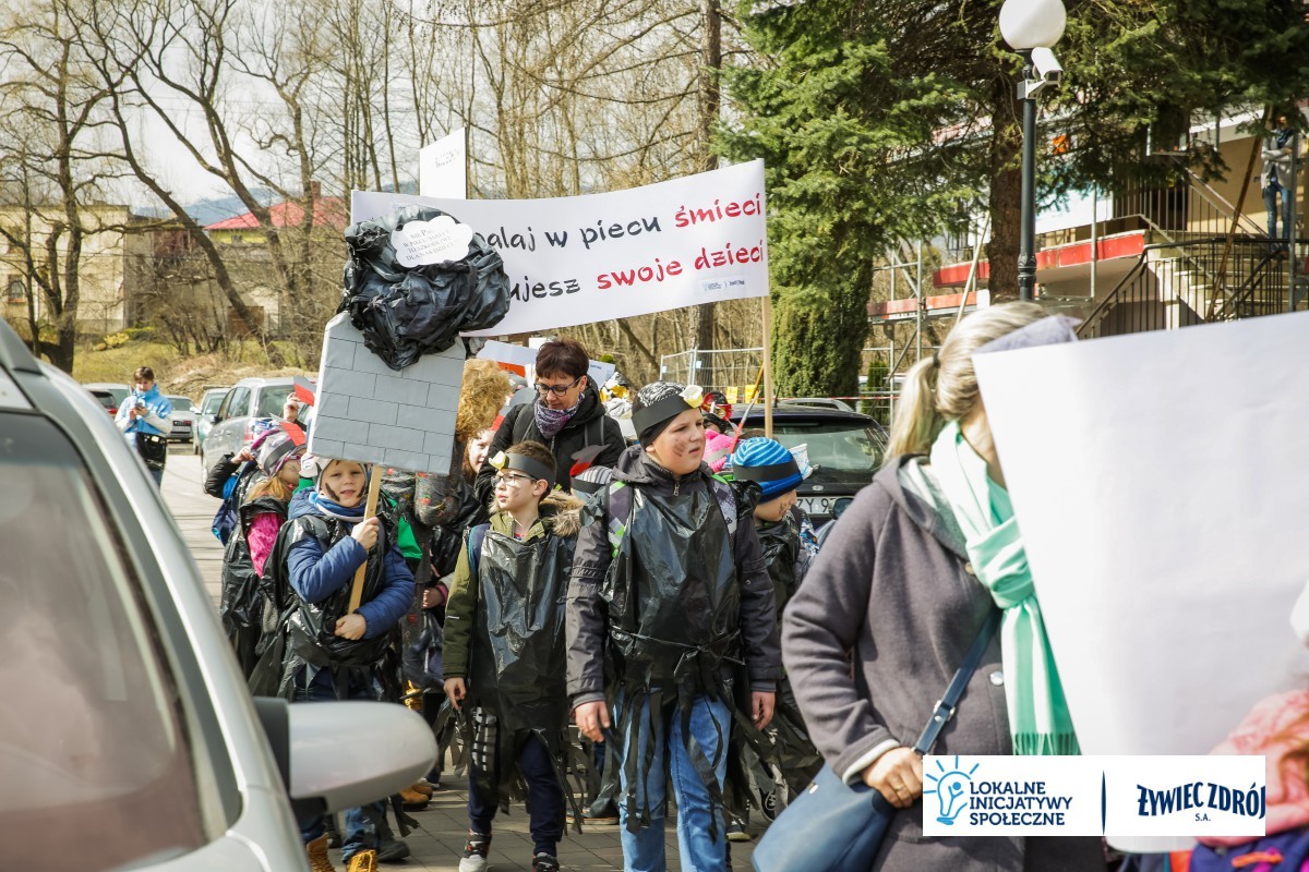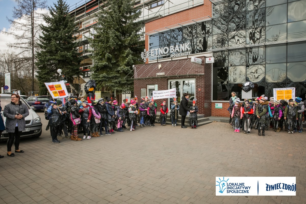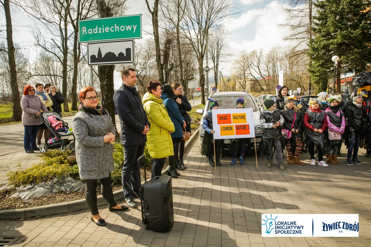 Podczas happeningu uczniowie przebrani w stroje przypominające dymiące kominy lub wysypiska śmieci, przeszli główną ulicą miejscowości. Dzieci niosły plakaty i transparenty, śpiewały piosenki oraz wykrzykiwały hasła, nawołujące do zaprzestania spalania śmieci w piecach domowych. Barwny korowód zainteresował mieszkańców wsi. Na zakończenie happeningu uczniowie wraz z przedszkolakami udali się do Urzędu Gminy Radziechowy –Wieprz. Dzieci przedstawiły krótki program artystyczny, w którym zachęcały mieszkańców i pracowników gminy do ekologicznego trybu życia.