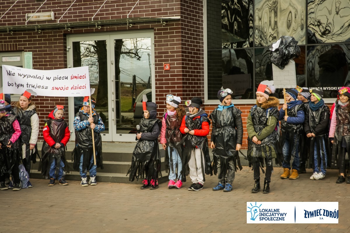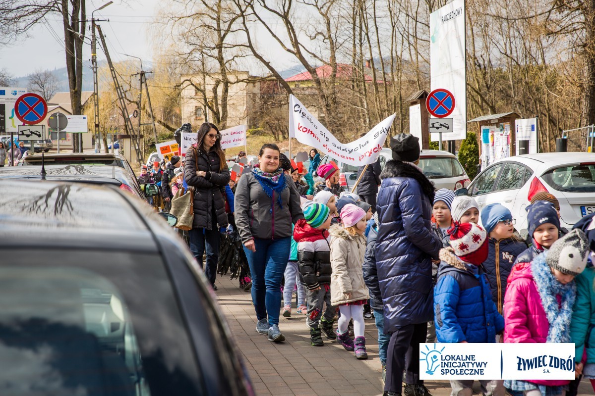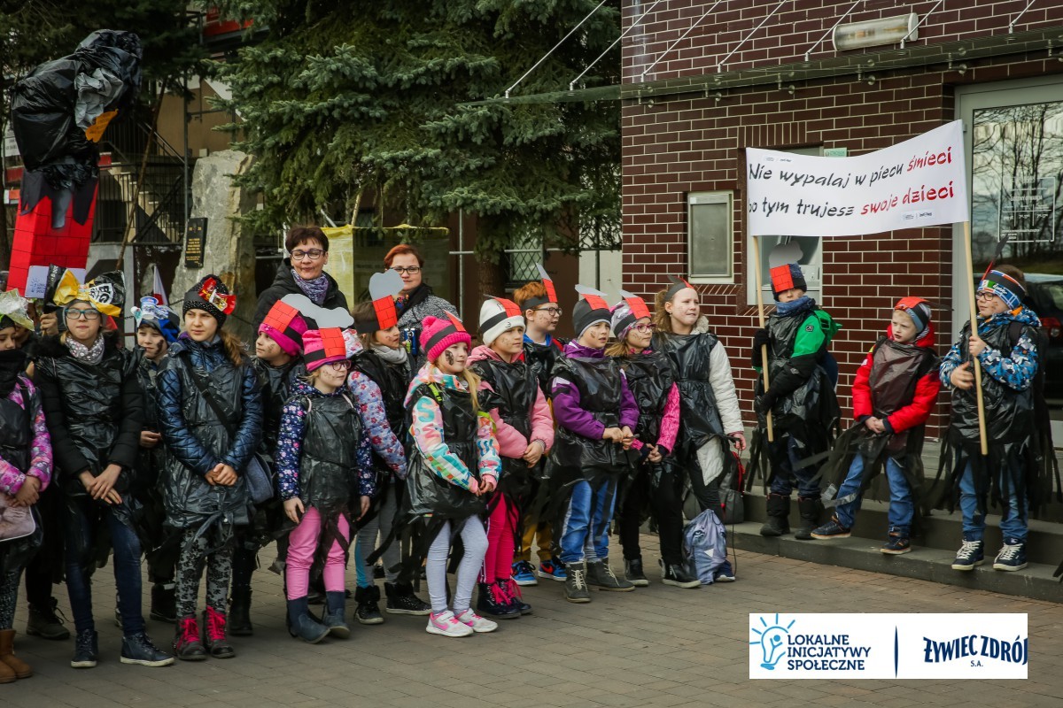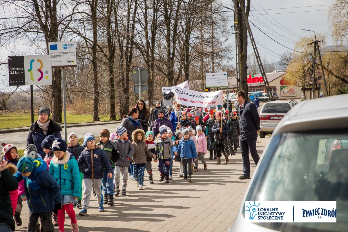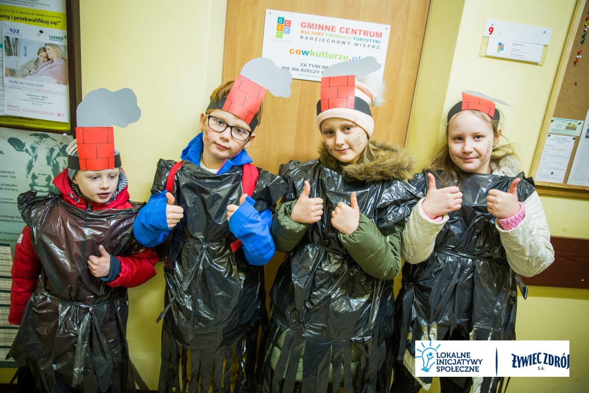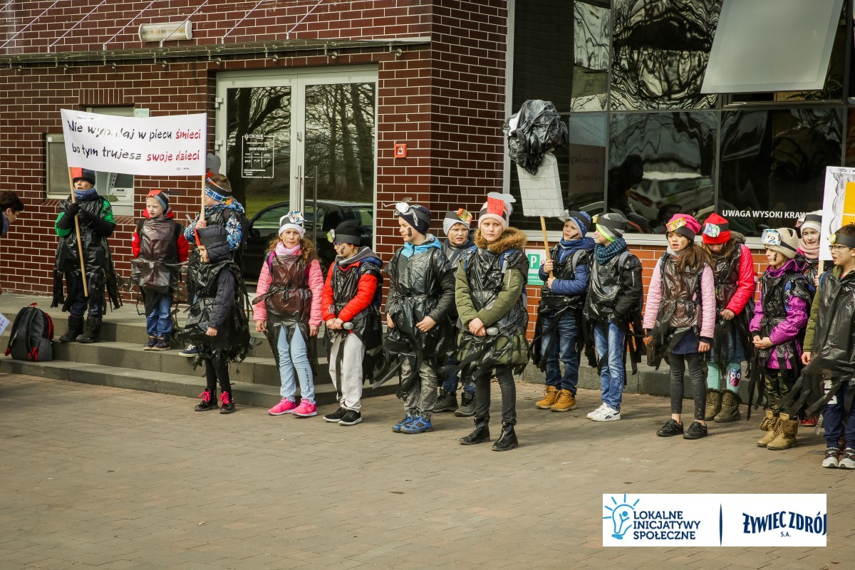 Podczas happeningu uczniowie przebrani w stroje przypominające dymiące kominy lub wysypiska śmieci, przeszli główną ulicą miejscowości. Dzieci niosły plakaty i transparenty, śpiewały piosenki oraz wykrzykiwały hasła, nawołujące do zaprzestania spalania śmieci w piecach domowych. Barwny korowód zainteresował mieszkańców wsi. Na zakończenie happeningu uczniowie wraz z przedszkolakami udali się do Urzędu Gminy Radziechowy –Wieprz. Dzieci przedstawiły krótki program artystyczny, w którym zachęcały mieszkańców i pracowników gminy do ekologicznego trybu życia.