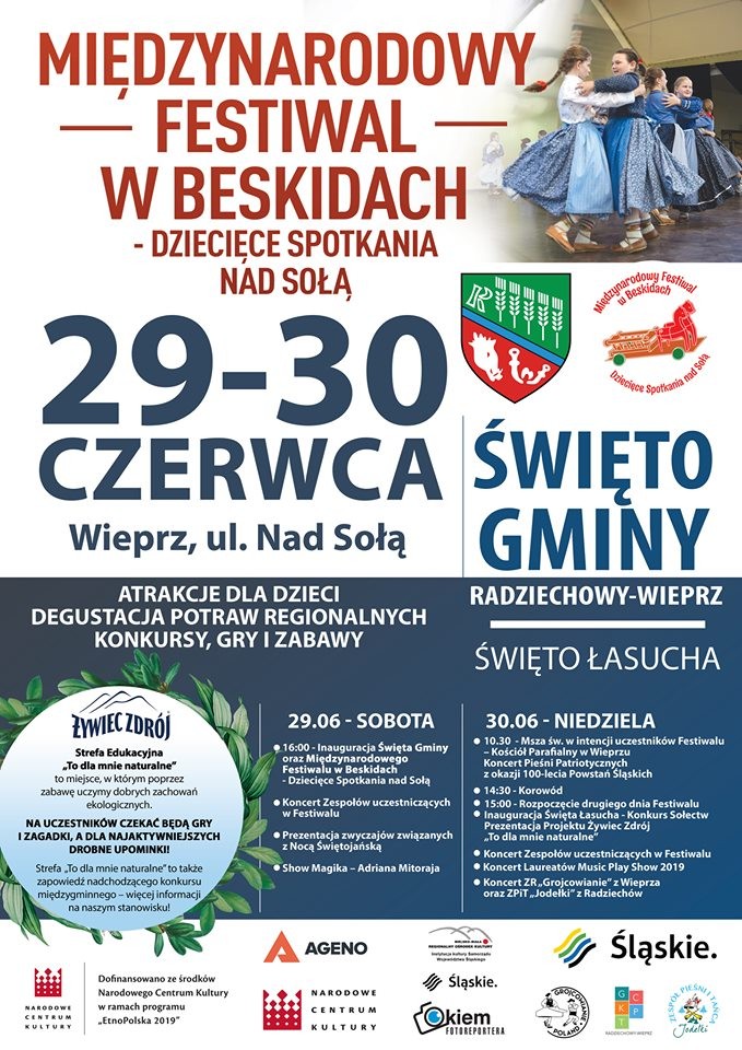 Gminne Centrum Kultury, Promocji, Turystyki Radziechowy-Wieprz oraz Stowarzyszenie Społeczno-Kulturalne Grojcowianie z Wieprza, serdecznie zapraszają na Święto Gminy, które zbiegnie się w tym roku z zupełnie nowym wydarzeniem jakim jest I Międzynarodowy Festiwal w Beskidach „Dziecięce spotkania Nad Sołą”. Podczas Święta Gminy odbędzie się tradycyjny przegląd Potraw Regionalnych o nazwie „Dzień Łasucha”, który w tym roku stanie się konkursem Sołectw. Wydarzenia odbędą się w dniach 29-30 czerwca 2019 r.