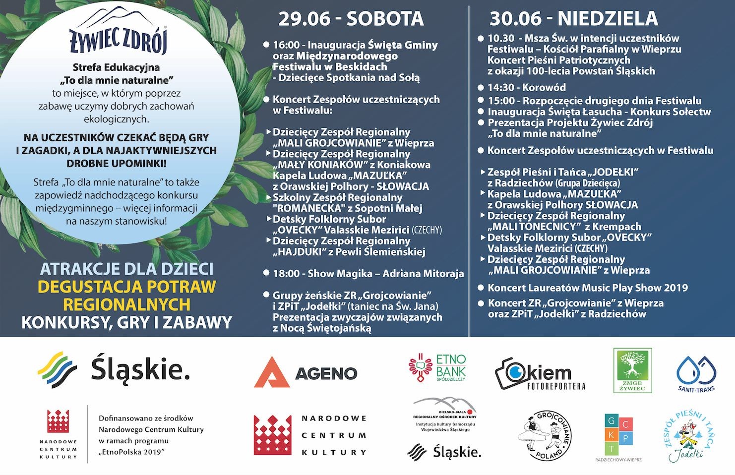 - 16:00 - Inauguracja Święta Gminy oraz Międzynarodowego Festiwalu w Beskidach - Dziecięce Spotkania Nad Sołą