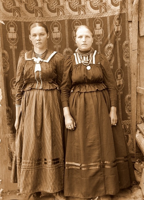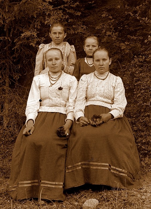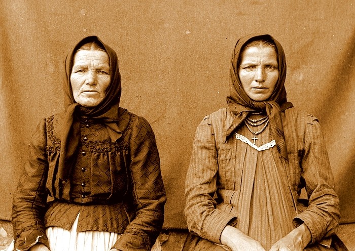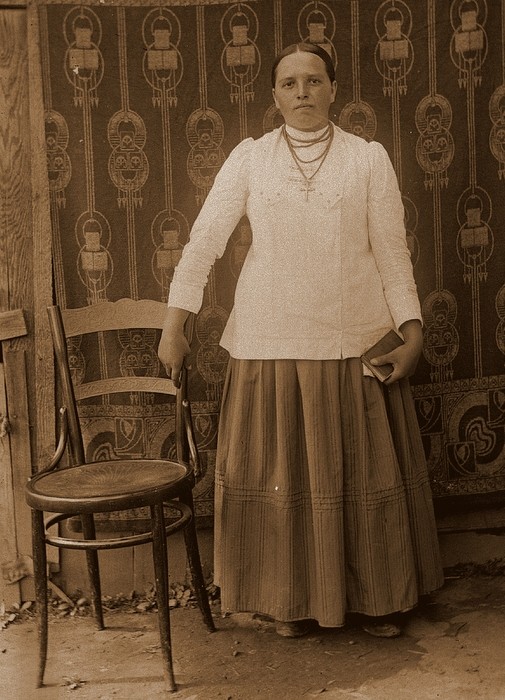 Na wielu zdjęciach ubiory kobiet odzwierciedlają ludowy kanon estetyczny. W tradycyjnej kulturze ludowej krągłość kształtów i kopiastość figury były synonimem piękna. U osób bardziej przywiązanych do dawnych wartości, również w strojach widoczne są tendencje zachowawcze. Kobiety ubrane są w dopasowane w pasie jakle z baskinką, szerokie, suto marszczone spódnice, fartuchy, chustki i czepce oraz chusty „odziewaczki”. Osoby bardziej podatne na zmianę, zwłaszcza młodsze kobiety, łatwiej przyjmowały nowsze trendy mody, starając się jednak dopasować je do dawnego kanonu. Stąd nowego kroju kaftaniki bogato zdobione pasmanterią, szyte także na karczkach, nieraz dopasowane w pasie gumką, formą nadal nawiązywały do wcześniejszych jakli, ładnie rozkładając się na szerokich spódnicach zdobionych naszytymi u dołu taśmami. Na spódnice szyte często z tego samego co kaftaniki materiału raczej nie zakładano już fartuchów, mimo iż niektóre posiadają na środku przodu widoczny szew świadczący o tym, że szyte były jeszcze z myślą o noszeniu pod fartuchem.