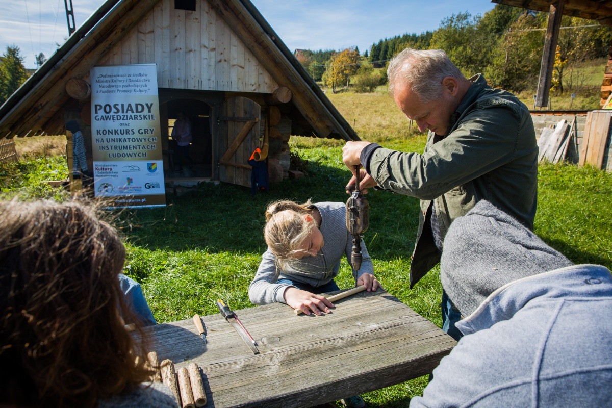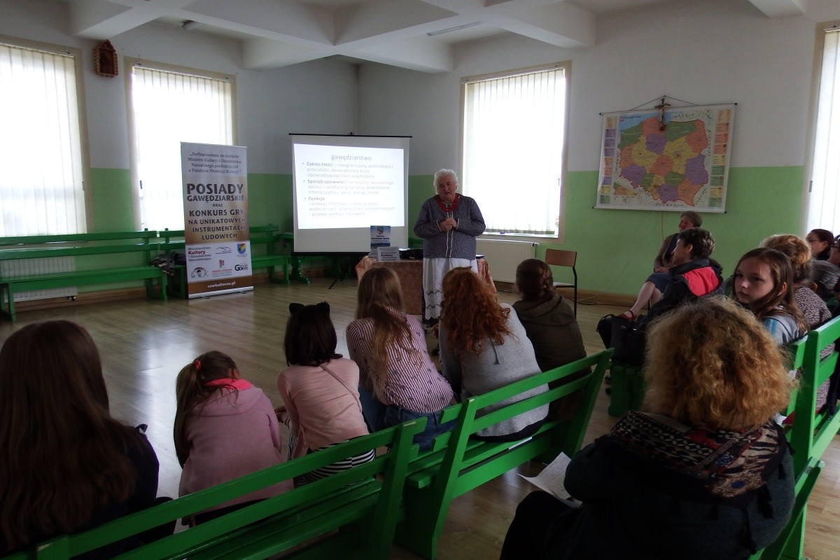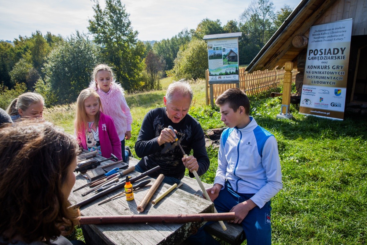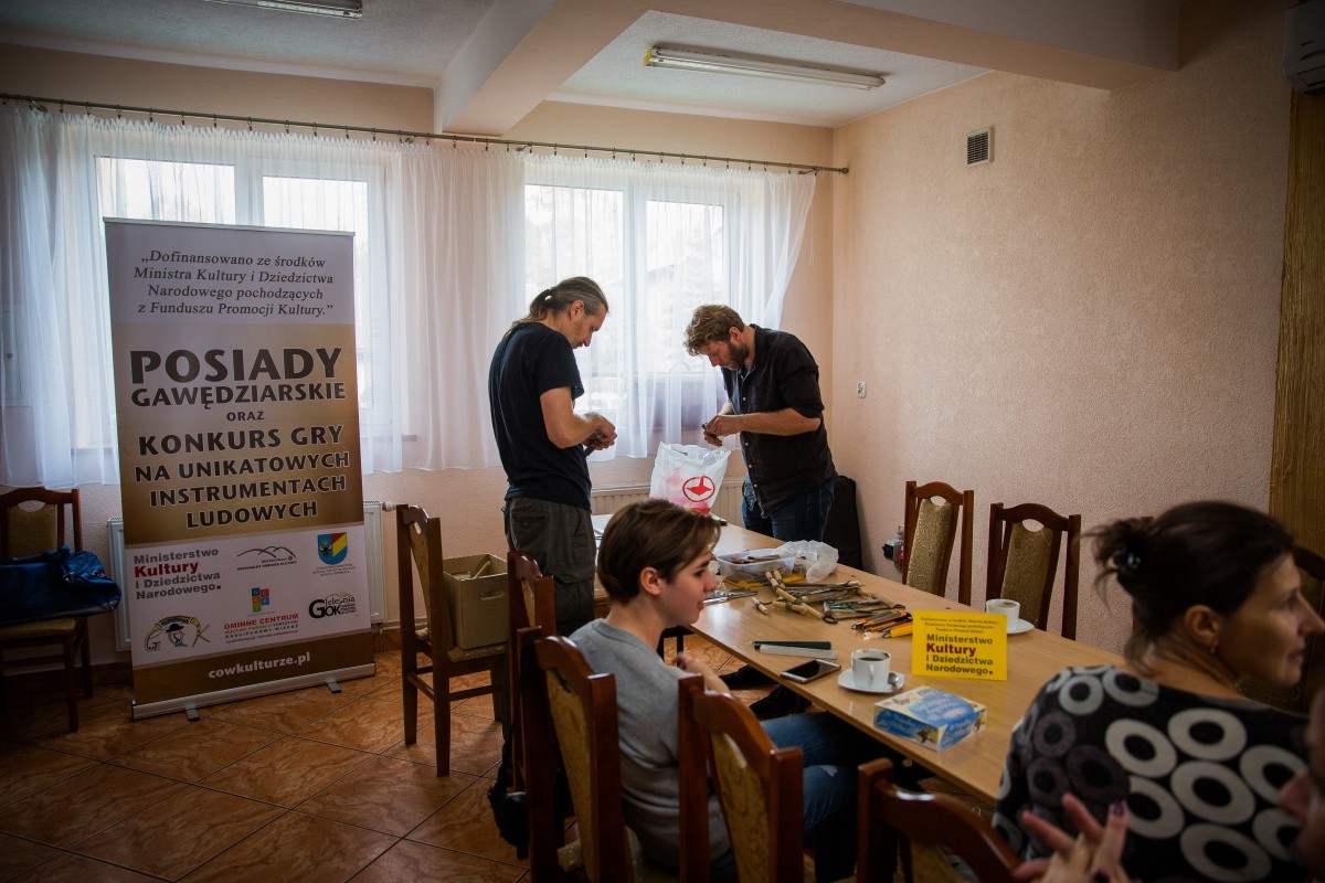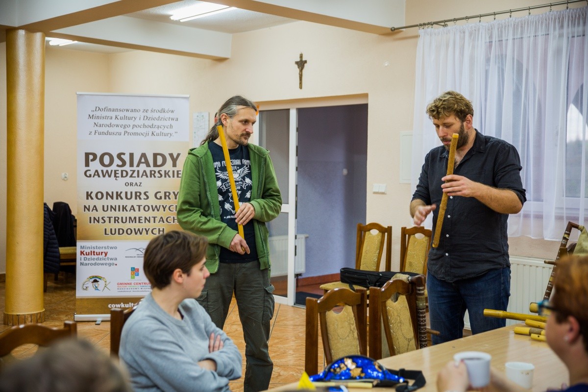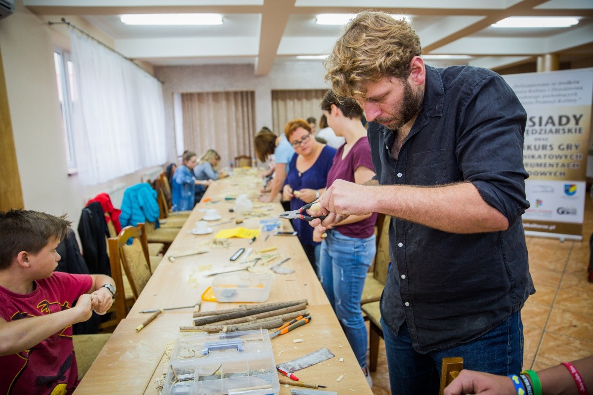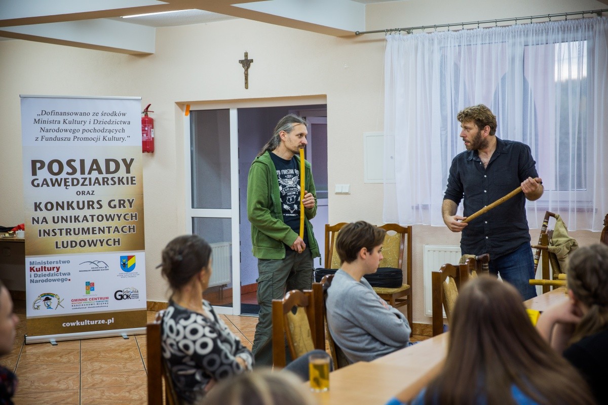 Warsztaty te kierowane były do uczestników konkursu oraz do wszystkich osób chcących wziąć udział w tym przedsięwzięciu, w celu podniesienia świadomości dzieci, młodzieży i osób dorosłych kultywujących lokalne tradycje słowno-muzyczne. W sumie w warsztatach wzięło udział 96 osób. Warsztaty gwary i zachowania scenicznego dla gawędziarzy prowadzone były przez Panie Barbarę Rosiek i Walerię Prochownik oraz przez Pana Eugeniusza Jachyma, natomiast warsztaty z budowy unikatowych instrumentów ludowych i muzyki ludowej, przez Pana Zbigniewa Wałacha oraz Panów Marcina Blachury i Przemysława Ficka. Warsztaty były bardzo owocne, poznaliśmy tajniki powstawania instrumentów ludowych oraz poszerzyliśmy wiedzę aktorską. Liczymy, że w przyszłości wykorzystamy tę wiedzę i będziemy szerzyć ją dalej. Wszystkich serdecznie zachęcamy do wzięcia udziału w XXVII Posiadach Gawędziarskich oraz XXIX Konkursie Gry na Unikatowych Instrumentach Ludowych.