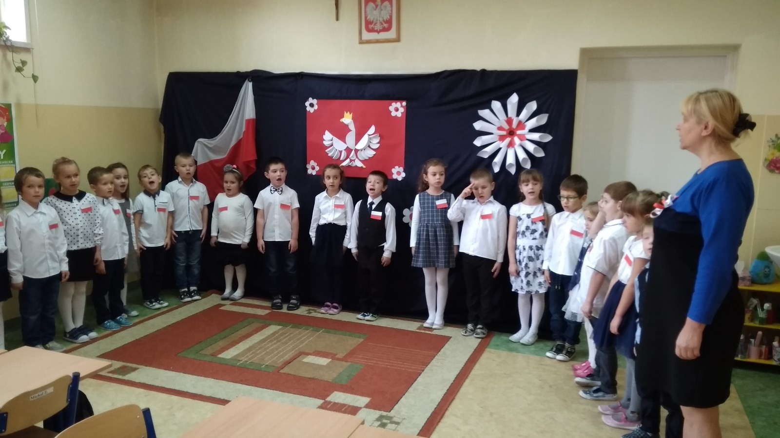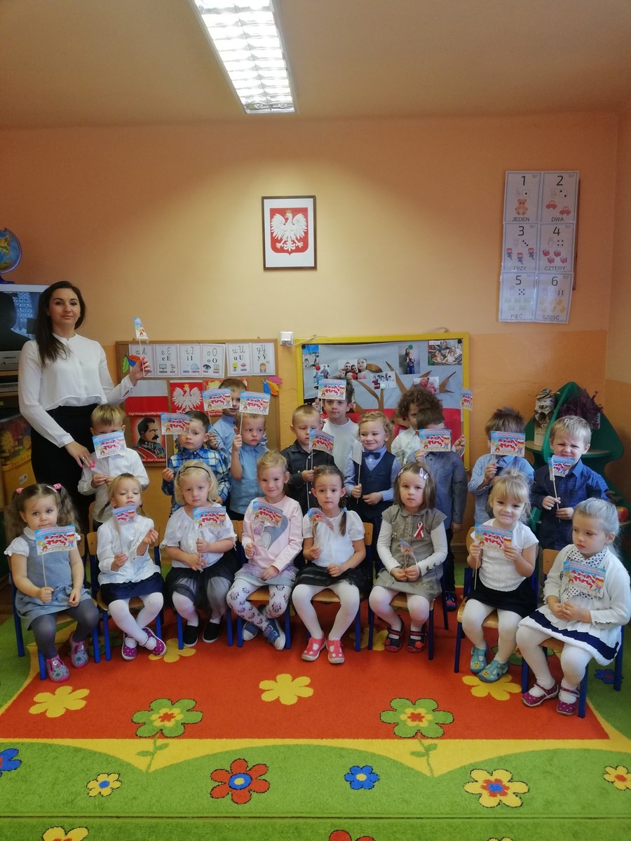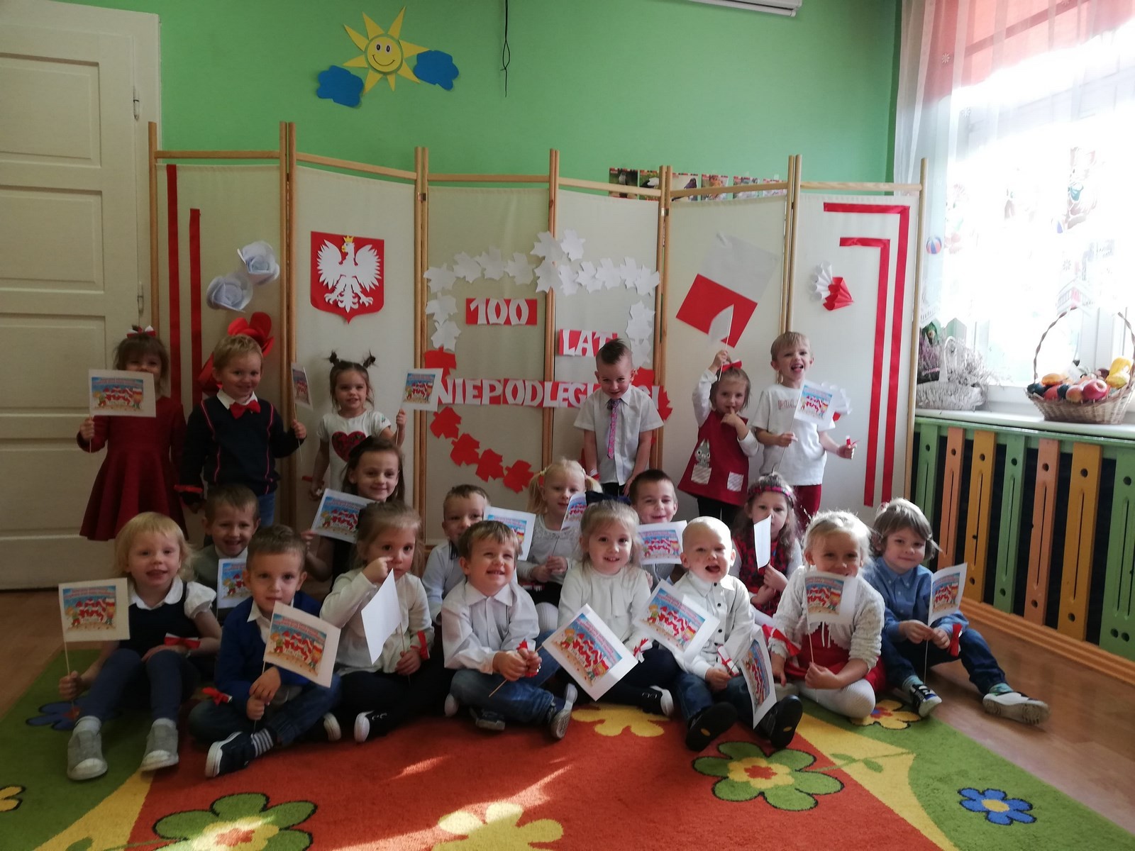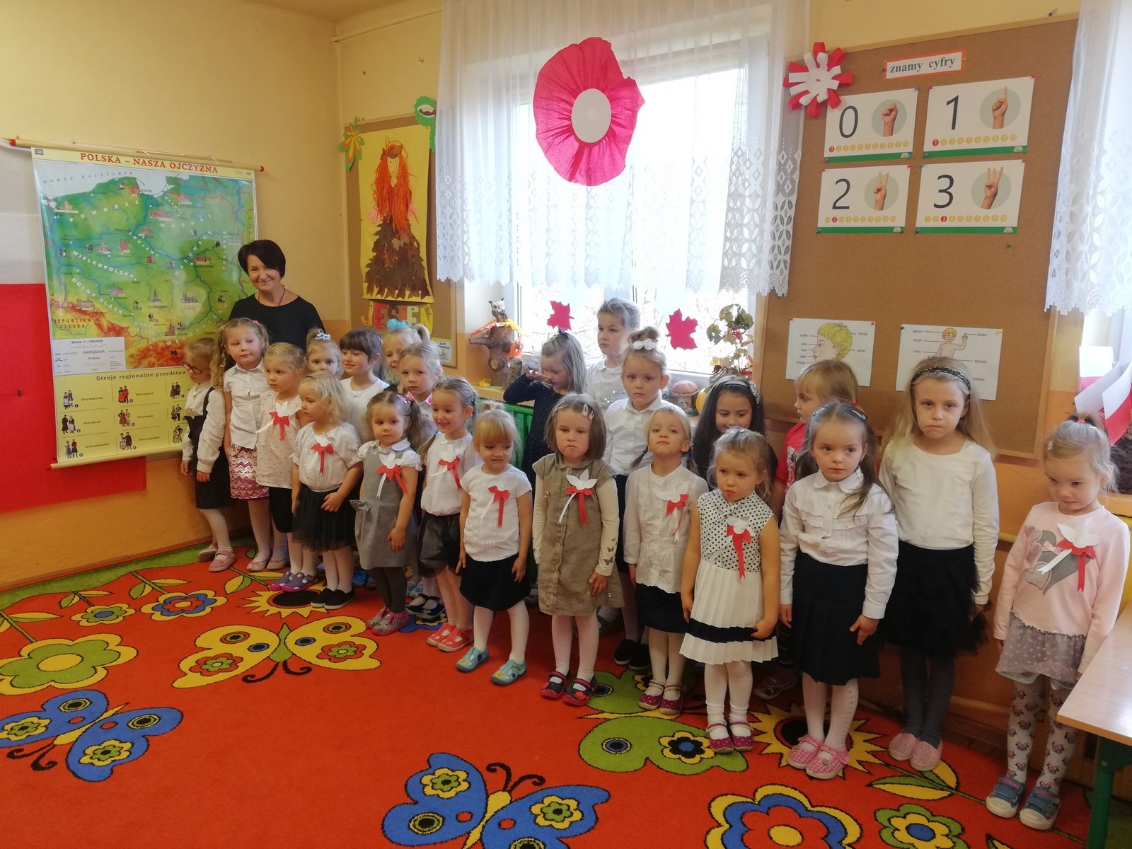 W czasie „patriotycznych poranków” czytelniczych rodzice czytali przedszkolakom wybrane legendy polskie oraz poezję polskich autorów o tematyce patriotycznej. Na zajęciach muzycznych nauczyły się hymnu narodowego, piosenek o Polsce oraz tańców ludowych naszego regionu, a na zajęciach artystycznych wykonały z wychowawczyniami symbole narodowe: min. biało-czerwone chorągiewki, orła w koronie, kotyliony oraz wiele prac plastycznych, które zawisły w galerii dla rodziców. Odświętnie zostały również przystrojone sale zajęć oraz korytarze.