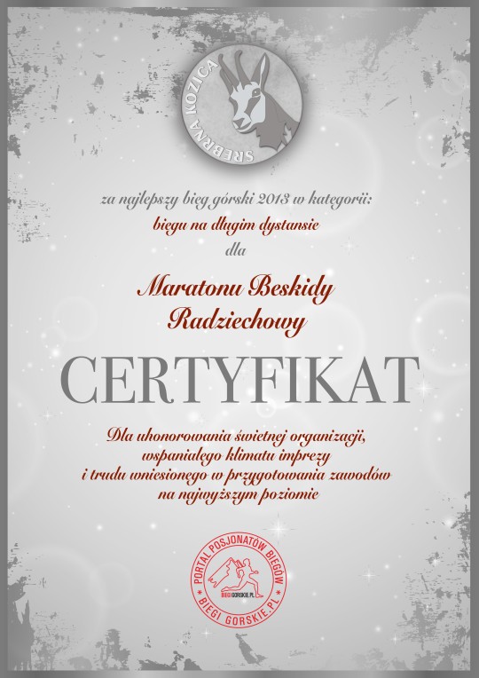 W dotychczasowych zmaganiach zdobyliśmy już Złotą, 2 razy Srebrna i 1 Brązową Kozice. Tym razem nie było inaczej, nasz VI Maraton Beskidy rywalizował w kategorii Bieg Górski na Długim Dystansie. Tu najlepszy okazał się Bieg Wysokogórski im. Druha Franciszka Marduły rozgrywany w ramach Mistrzostw Polski Skirunning – Zakopane, a Srebrna Kozica pojedzie do Radziechów za VI Maraton Beskidy, trzecie miejsce przegrywając zdecydowanie zdobył Maraton Karkonoski będący Mistrzostwami Świata na długim dystansie – Szklarska Poręba. Warto nadmienić że w pokonanym polu nasz Maraton Beskidy, pozostawił wiele znanych biegów. Drugi nasz bieg, który debiutował w tym roku w tej samej kategorii to organizowany w Opawie koło Lubawki – dolnośląskie Bieg WOP-isty zdobył zaszczytne 10 miejsce. Warto w tym miejscu nadmienić, że głosować mogą tylko uczestnicy biegu w którym się startowało. Oba nasze biegi mają bardzo ograniczony budżet, a mimo tego wśród takich tuzów mogą znaleźć się w czołówce, co jest na pewno wielkim osiągnięciem. W tym miejscu jeszcze raz chciałbym podziękować wszystkim tym którzy przyczynili się do tego, że nasze imprezy podobały się uczestnikom i to zarówno w Radziechowach jak i w Opawie. Na najwyższe wyróżnienie zasługuje cała rodzina Dudków, która przez wiele dni angażowała się w organizacje całego Mitingu Biegowego 2013' i oczywiście uczestnicy naszych zawodów, bez Was kochani zawodniczki i zawodnicy nawet najlepiej zorganizowana impreza nie ma szansy powodzenia. A więc jeszcze raz dziękuje i już dziś zapraszamy na Miting Biegowy 2014', VII Maraton Beskidy odbędzie się 8.11.2014 r w Radziechowach.