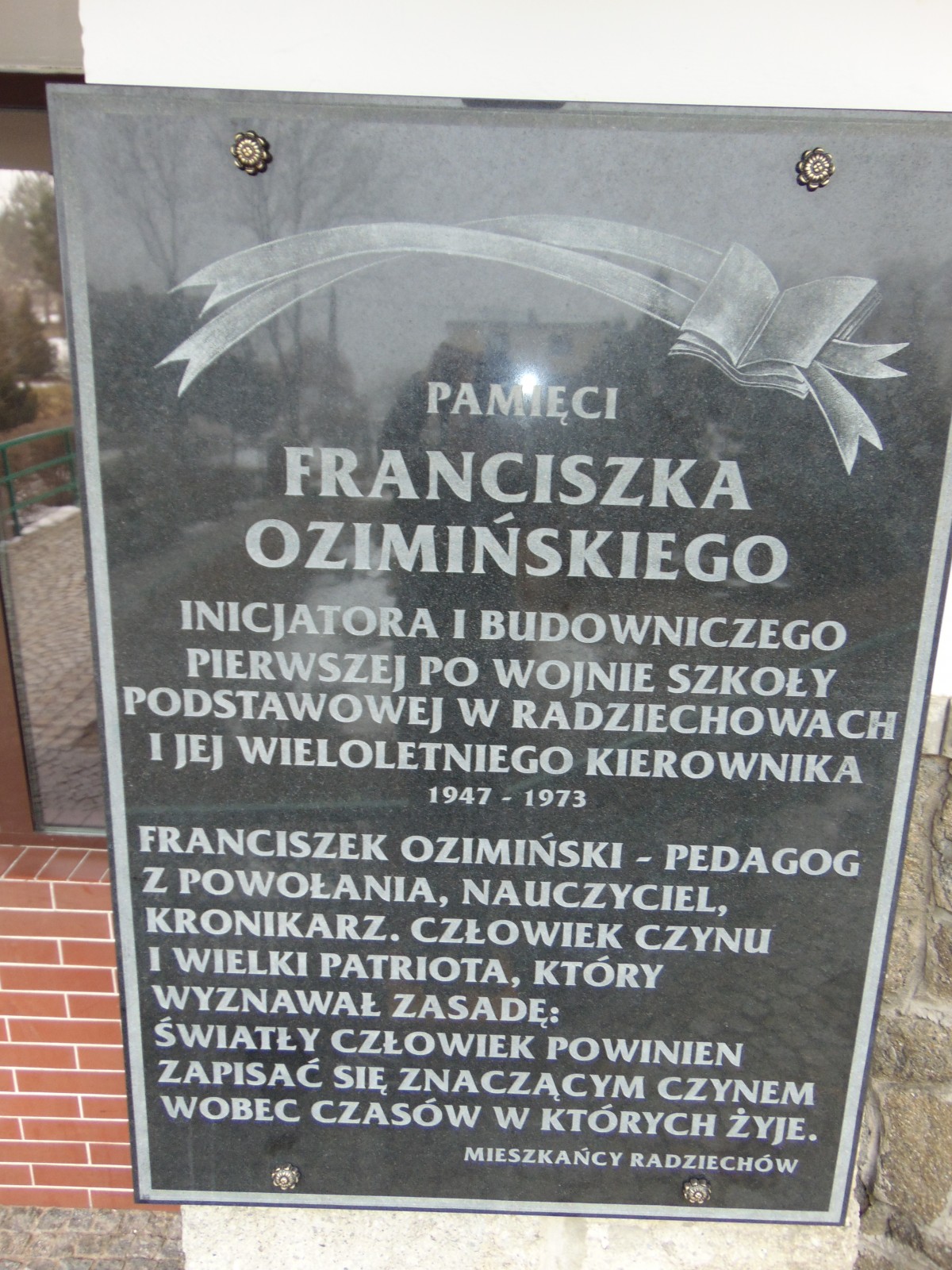 By pamięć o nim nie zanikła, a młode pokolenia pamiętały o jego zasługach, 14 października 2016r. podczas Święta Edukacji Narodowej i Święta Patrona Szkoły uroczyści odsłonięto tablicę pamiątkową poświęconą panu Franciszkowi Ozimińskiemu.