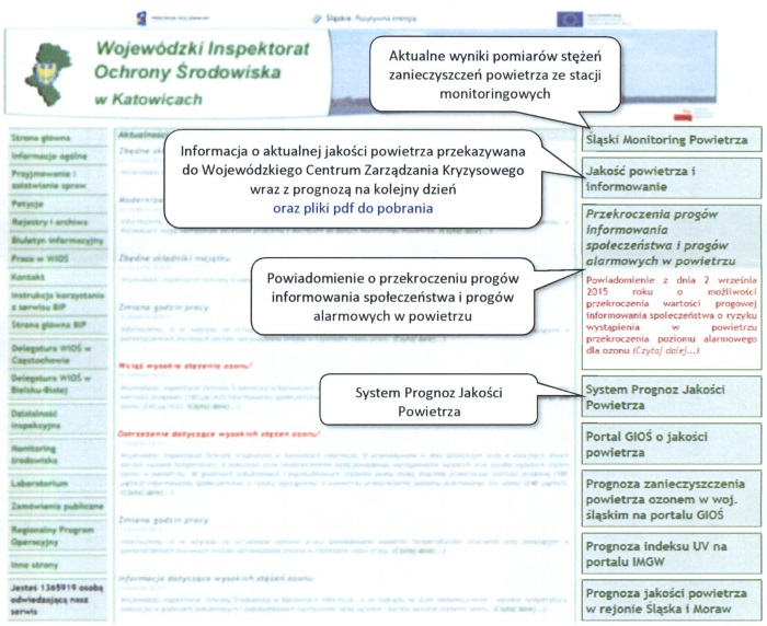 Wojewódzki Inspektorat Ochrony Środowiska w Katowicach od wielu lat w bardzo szeroki sposób informuje społeczeństwo o bieżącej jakości powietrza jak również o prognozowanej jakości powietrza na kolejną dobę.