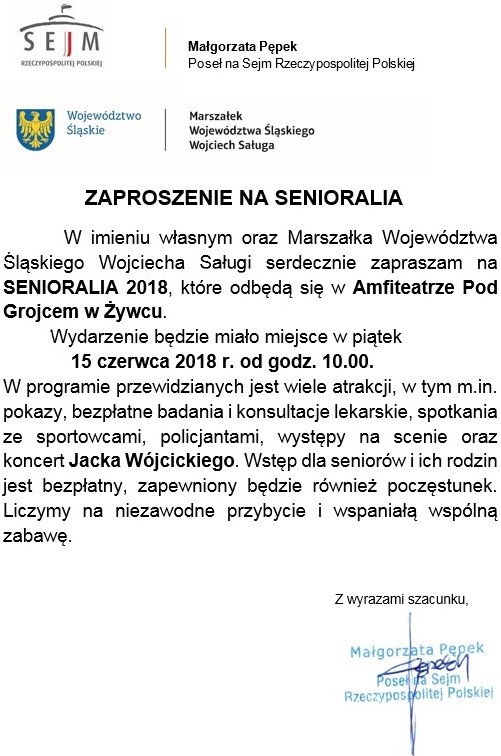 Senioralia 2018 - Amfiteatr Pod Grojcem w Żywcu, 15 czerwca 2018 r., od godz. 10:00. Wstęp dla seniorów i ich rodzin jest bezpłatny!