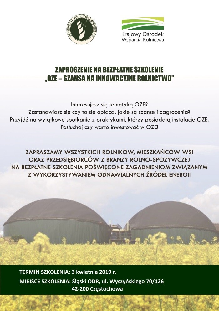 Zaproszenie na Szkolenie pt. ''OZE – szansa na innowacyjne rolnictwo''
