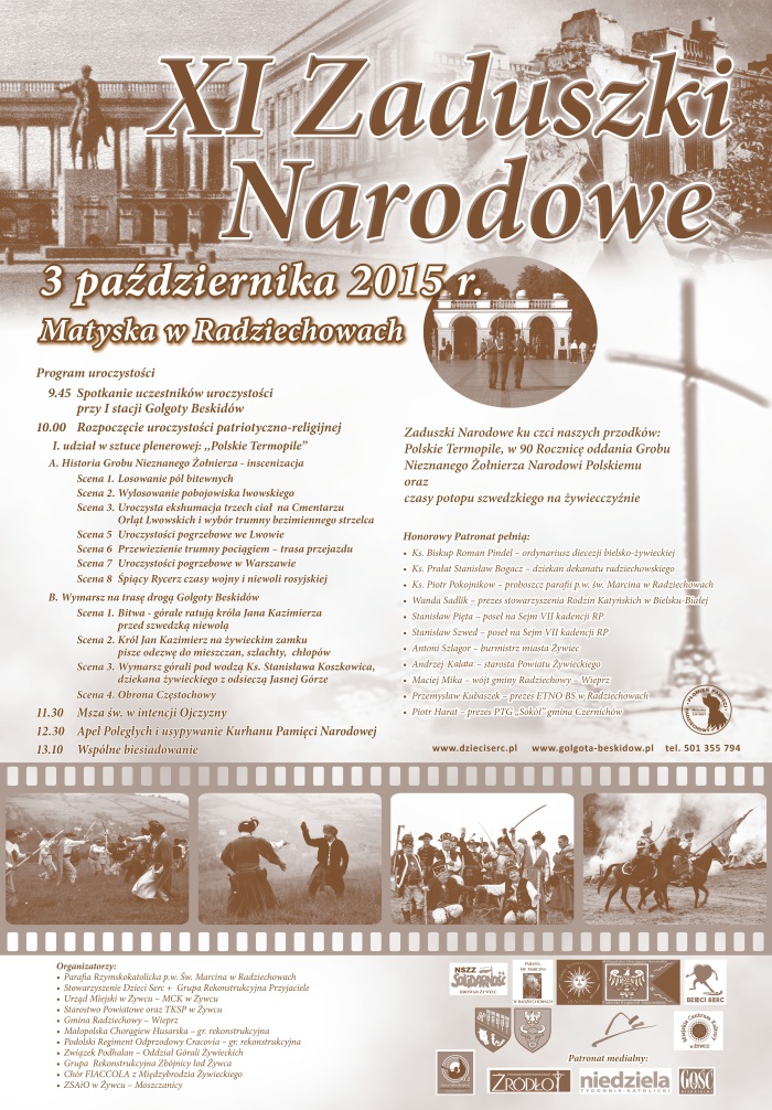 Komitet honorowy obchodów XI Zaduszek Narodowych na Górze Matysce w Radziechowach zwraca się z prośbą o współtworzenie w/w uroczystości patriotyczno-religijnej. W tym roku, podczas uroczystości oddamy hołd walczącym w bitwach uznanych jako ,,Polskie Termopile" Będzie to wyjątkowa lekcja historii, tej mało znanej i skrzętnie skrywanej historii naszej Ojczyzny. Za pomocą rekonstrukcji wydarzeń - powstania grobu Nieznanego Żołnierza, przybliżymy klimat tamtych tragicznych, ale jakże ważnych dla Polski chwil. Czasy potopu szwedzkiego przedstawiane w ubiegłym roku również będą przedstawiane i można w nich współuczestniczyć.
