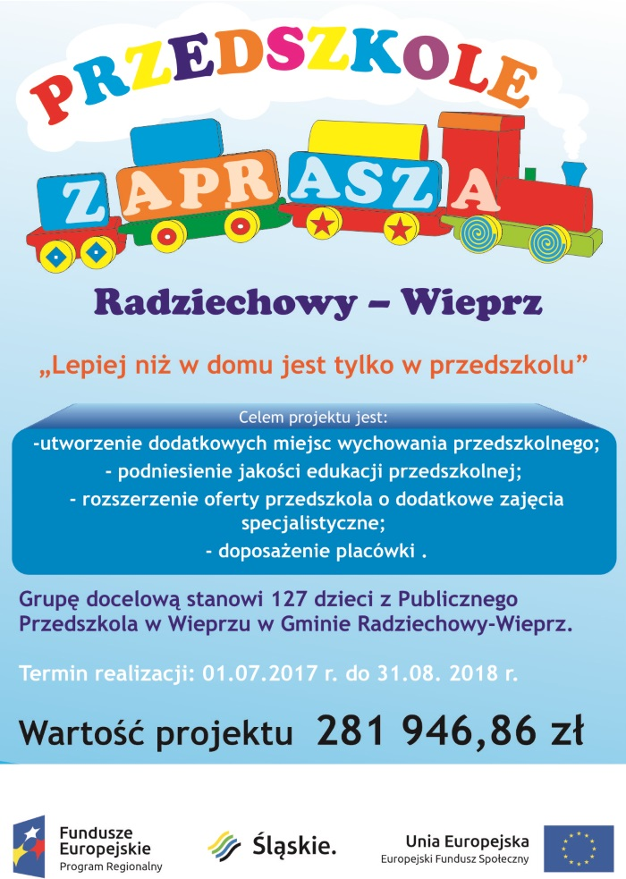 W Gminie Radziechowy-Wieprz z dniem 01.07.2017 r. rozpoczęła się realizacja Projektu w ramach Regionalnego Programu Operacyjnego Województwa Śląskiego dla osi priorytetowej XI. Wzmocnienie potencjału edukacyjnego.
