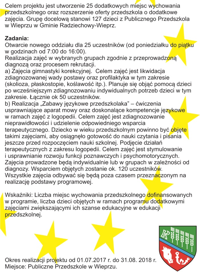 Głównym celem projektu jest poprawa jakości usług świadczonych w Przedszkolu Publicznym w Wieprzu poprzez zwiększenie dostępu do edukacji przedszkolnej, wyrównywanie szans dzieci w tym tych ze specjalnymi potrzebami dzięki wdrożeniu kompleksowych działań dydaktycznych i organizacyjnych wzbogacających zakres i jakość oferty edukacyjnej.