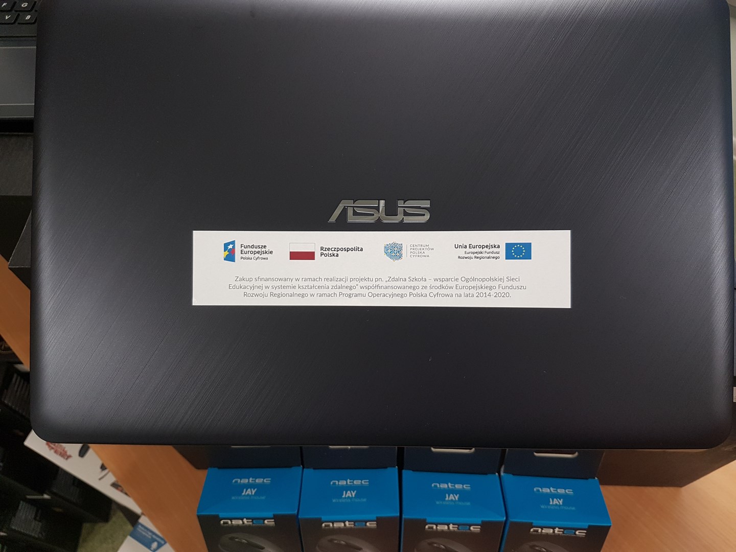 Zakup laptopów sfinansowany w ramach realizacji projektu pn. „Zdalna Szkoła” – wsparcie Ogólnopolskiej Sieci Edukacyjnej w systemie kształcenia zdalnego” współfinansowanego ze środków Europejskiego Funduszu Rozwoju Regionalnego w ramach Programu Operacyjnego Polska Cyfrowa na lata 2014-2020.